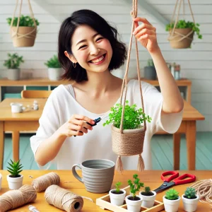 手順としては、まずマクラメロープや麻ひもを使ってプランターを包む仕組みを作ります。複雑な編み方に挑戦したい場合は、マクラメ編みの手法を参考にすると、見た目がよりおしゃれになります。ただし、初心者の場合はシンプルにロープを交差させてプランターを支える形に仕上げても十分です。