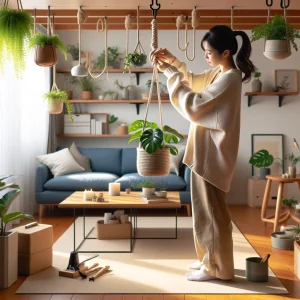 設置方法は非常に簡単です。粘着式フックやS字フックを取り付ける場所を決め、ロープを用いて植物を吊るします。ロープの結び方を工夫することで、デザイン性を持たせることも可能です。例えば、マクラメ編みを取り入れると、ナチュラルで温かみのある雰囲気を演出できます。一方、シンプルにロープを結ぶだけの方法でも、スッキリとした見た目が楽しめます。