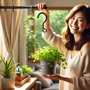 また、カーテンレールも賃貸で活用しやすい場所です。S字フックを掛けて植物を吊るすだけで設置が完了するため、特別な工具も必要ありません。窓際に植物を吊るせば、自然光を十分に取り入れられ、観葉植物の成長に適した環境を作ることができます。