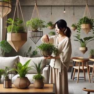 観葉植物を吊るす際におしゃれな空間を作りたい場合、アイテム選びが重要なポイントとなります。吊るすアイテムのデザインや素材にこだわることで、インテリア全体の雰囲気が格段に向上します。