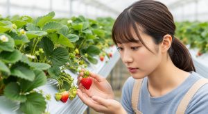 - 果実の硬さで選ぶ東京都が開発した「東京おひさまベリー」という露地専用品種があるんですが、これは果実が「やや硬い」のが特徴だそうです。果実が硬いと、多湿環境でも傷みにくく、収穫期の大敵である灰色カビ病の発生が少なくなるという、トンネル栽培にとって理想的な特性を持っています。