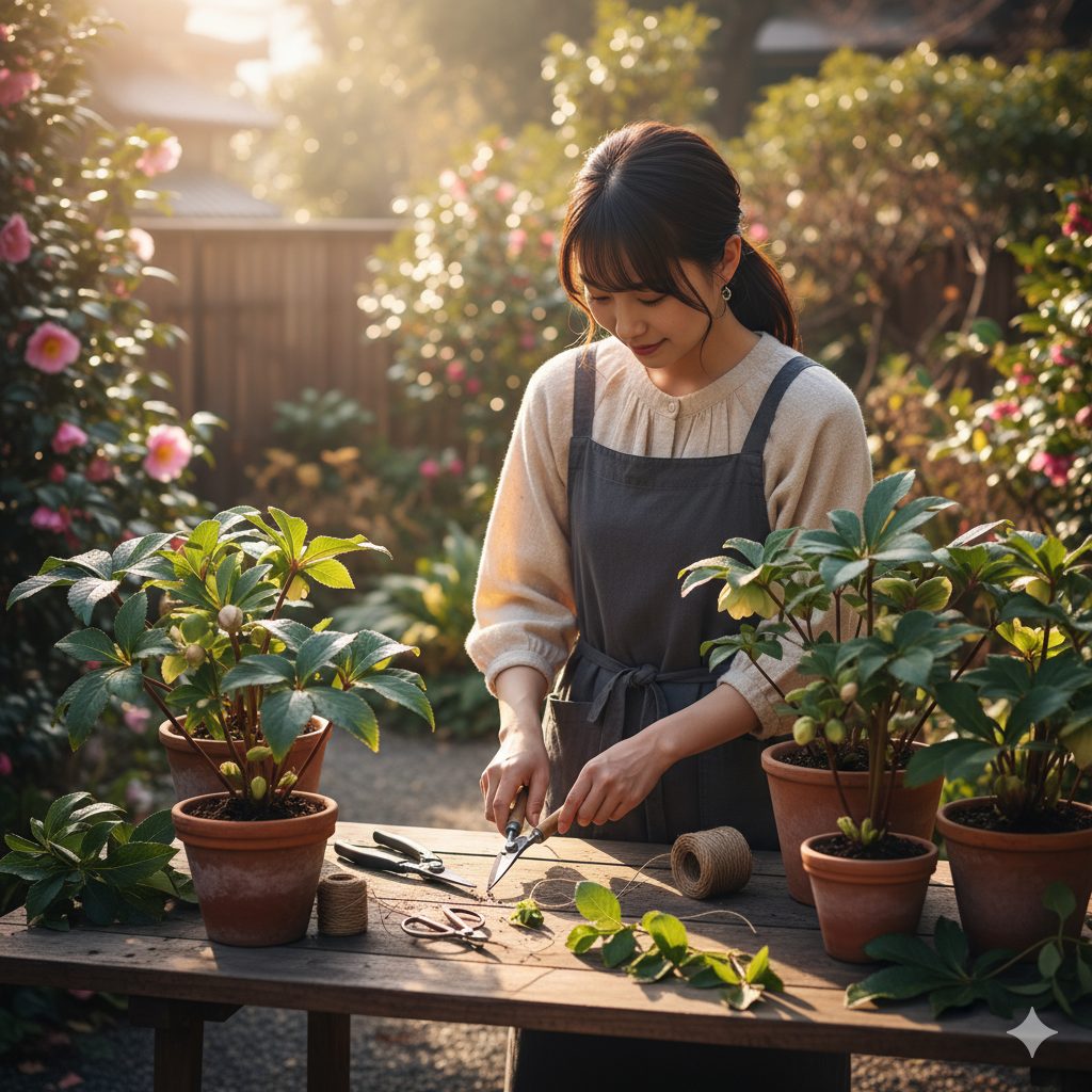 <img src="h1_title.jpg" alt="11月の庭でクリスマスローズの手入れを準備する日本人女性">